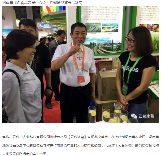 云臺冰菊不僅凸顯了河南綠色食品大家族、新發(fā)展和新形象,也為本屆博覽會“綠色理念、綠色生產(chǎn)、綠色消費(fèi)”主題貢獻(xiàn)了一己之力,受到蒞會領(lǐng)導(dǎo)、廣大市民、國內(nèi)外客商和各類媒體的廣泛關(guān)注和高度稱贊。